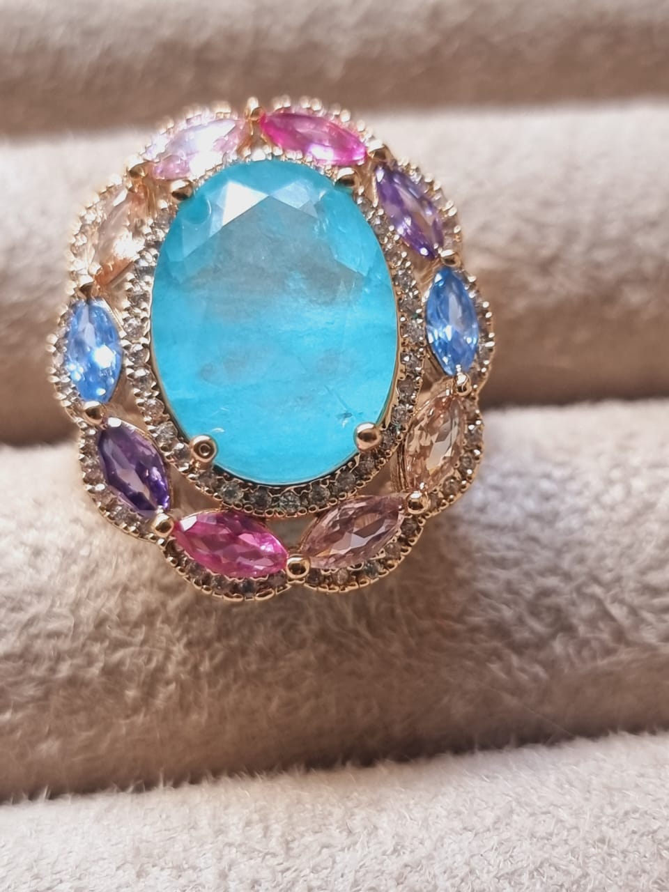 Anel cristal turmalina paraíba multicolor banho ouro amarelo 18k. Tamanho 17.