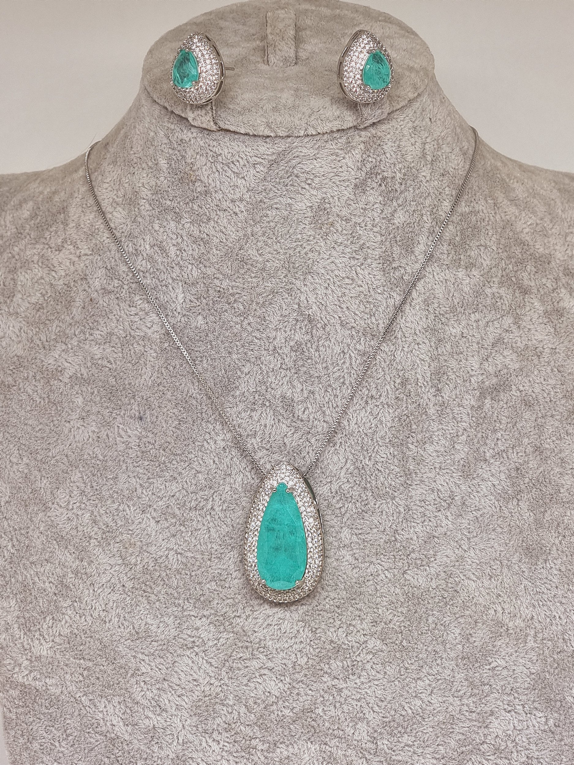Conjunto gota Corrente e Brinco fusion cor turmalina paraíba banho em ródio branco.